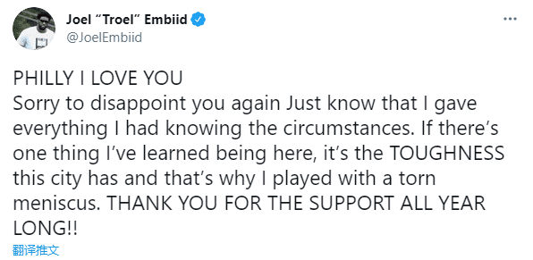 24直播网讯 北京时间6月21日,东部第一费城大比分3-4被淘汰出局,又一次输掉抢七无缘东决,赛后恩比德公开发表声明,直言费城我爱你,抱歉又让你失望了。