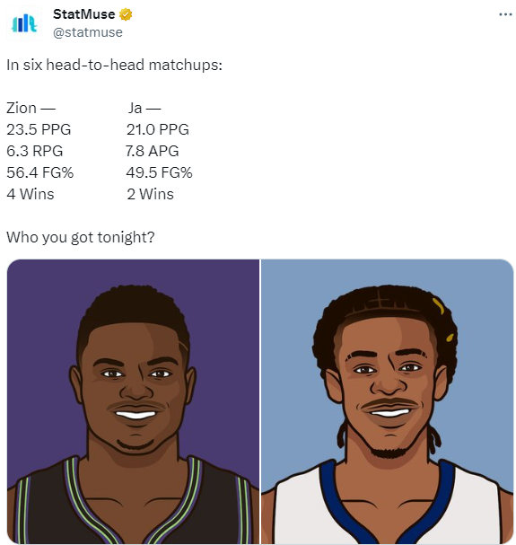 灰熊对阵鹈鹕,莫兰特确定复出,锡安因生病出战成疑,美媒StatMuse晒出两人此前6次交手的数据——锡安场均23.5分6.3篮板,命中率56.4%,取得4场胜利;莫兰特场均21分7.8助攻,命中率49.5%,取得2场胜利。