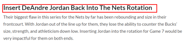 小乔丹虽然不再年轻,但依然能提供有效的护筐,并进行补扣和空接。至少,他能抢下一些篮板,如果篮网想要限制雄鹿的篮板优势,他们就应该把小乔丹放进轮换。