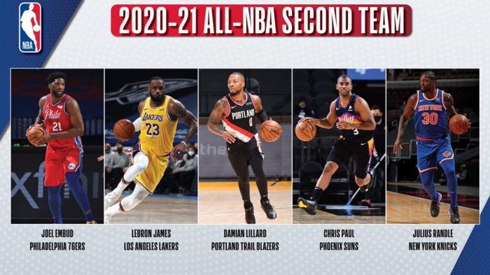 从最佳阵容投票结果来看,字母哥100张第一选票获得500分,是全联盟唯一一位全票入选最佳一阵的球员,另外四位一阵球员是库里、约基奇、东契奇和小卡;詹姆斯获得2张第一选票、44张第二选票和32张第三选票,总共174分排在第十位,刚好入选最佳二阵。