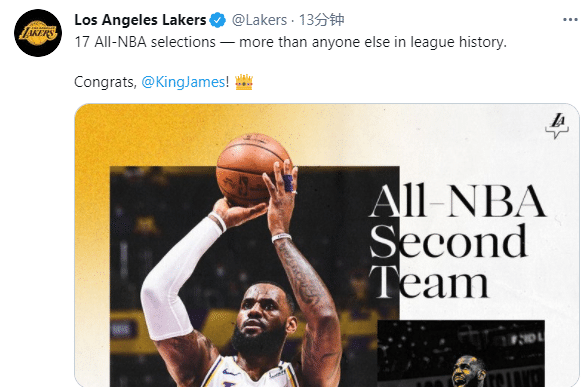 湖人官方第一时间恭喜詹姆斯,晒照并且发推写道:祝贺詹姆斯,17次最佳阵容,比联盟历史上任何人都多。