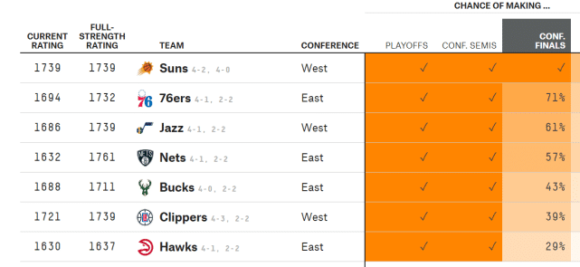 24直播网讯北京时间6月15日,2020-21赛季的分区半决赛激战正酣,除了太阳4-0横扫掘金率先晋级,其余三组对决的总比分都打到了2-2,竞争相当激烈!这意味着三组对决都将迎来天王山之战,数据网站FiveThirtyEight更新了三组对决的晋级概率(括号内为晋级概率)——