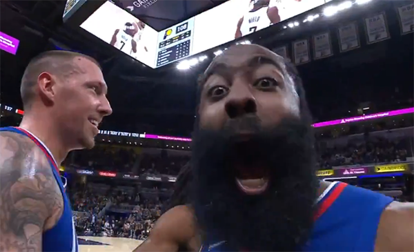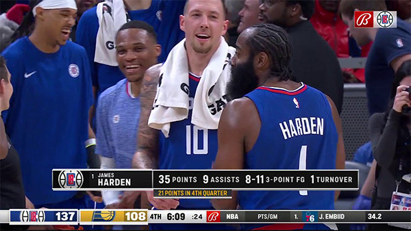 249秒轰21分!哈登狂刷8大纪录 快船替补席众生相卡威大笑庆祝