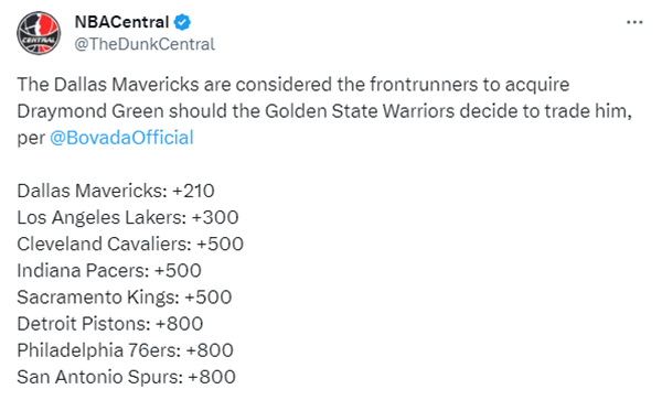 目前勇士陷入困境,格林被无限期禁赛后一些球队开始给勇士队打电话探索一些球员的交易;今日美媒列出追梦格林下家赔率,若勇士决定交易追梦,独行侠被认为是领跑的球队。
