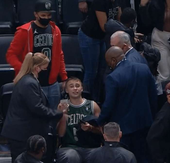 在返回更衣室途中,欧文被球迷扔水瓶,差点砸到欧文的脑袋,随后篮网球员围在球员通道入口处,找球迷讨说法;随后这位身穿加内特5号球衣的球迷被警方抓获并带走;此前威少被扔爆米花,特雷杨被吐痰,如此种种事件太恶劣。