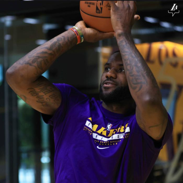詹姆斯身穿湖人紫色训练T恤,投篮时微微一笑;系列赛前三场,詹姆斯场均上场37.7分钟能够拿到20.7分5.7篮板9.3助攻2次抢断,虽然还没有打出昔日恐怖的全力詹模式,但詹姆斯关键时刻总能挺身而出。
