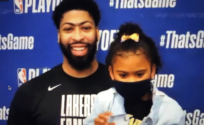 今天是詹姆斯和浓眉首次在斯台普斯的季后赛首胜,都说胜利是最好的良药,这点在湖人身上有最直接的体现,比赛结束之后,浓眉赛后把女儿带到了发布会,此役轰下34分11个篮板的浓眉哥也是很开心的。