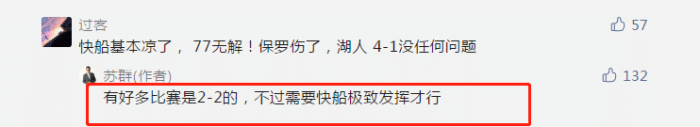 有球迷提问,“快船基本凉了,东契奇无解,保罗伤了,湖人4-1没问题”。而苏群回应,“有好多比赛2-2,不过快船需要极致发挥才行”。