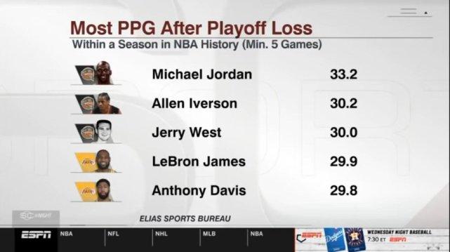 图上显示的是季后赛输球后,接下来一场的平均得分数据。詹姆斯场均29.9分,浓眉场均29.8分,一个排在历史第4位,另一个排在历史第5位。排名前三的依次是乔丹(33.2分)、艾弗森(30.2分)、韦斯特(30.0分)。这说明,詹姆斯和浓眉在输球后的比赛往往会迎来爆发,这也是湖人再次冲击总冠军的一大保障。