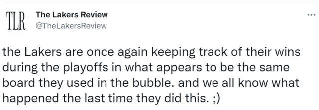 美媒The Laker Review转发了这张照片,并点评道:“湖人在季后赛再次关注获胜场数,看上去这是去年他们在奥兰多赛区用过的同一块板,我们都知道上一次他们这么做时发生了什么。”