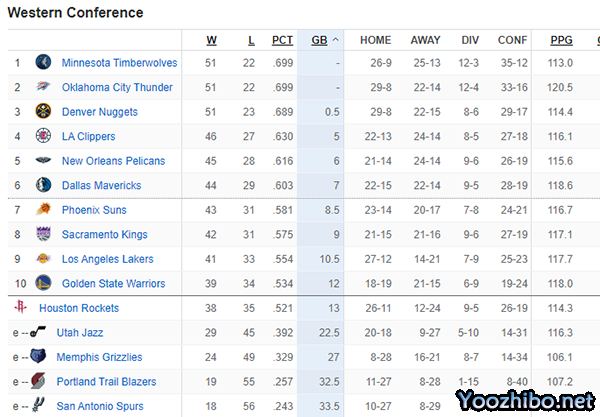 西部第7-10名依次:太阳、国王、湖人和勇士