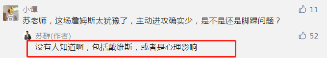 而对于为何詹姆斯只出手了13次,苏群的分析可能说对了,由于经常受伤,心理因素,不敢全力以赴了,而浓眉也是如此,受到了影响。