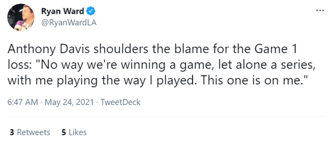 本场比赛,艾顿得到21分16篮板,其中8个是前场篮板。更可怕的一点在于艾顿11投10中,效率极高。相比之下,浓眉就太差了,只得到13分7篮板,个人正负值-18是全队最低,投篮也只有16中5。赛后,浓眉相当自责。他表示:“我再这么打,我们没法赢下一场比赛,更别说一轮系列赛。这场怪我,第二场我一定会打得更好,我们也会更好。”