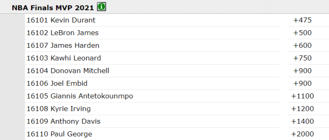 榜单排名第1-10位的球星依次是1.杜兰特(+475)、2.詹姆斯(+500)、3.哈登(+600)、4.莱昂纳德(+750)、5.米切尔(+900)、6.恩比德(+900)、7.字母哥(+1100)、8.欧文(+1200)、9.浓眉(+1400)、10.乔治(+2000)。
