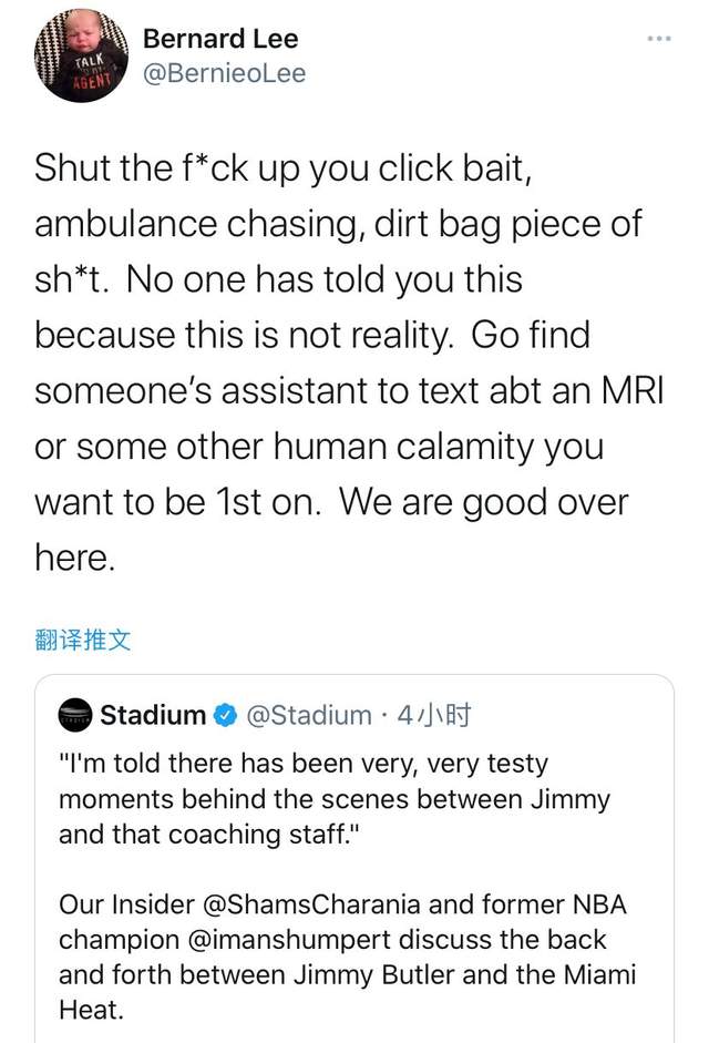 就当Shams传出巴特勒和热火之间存在矛盾的时候,巴特勒的经纪人却及时挺身而出,他在巴特勒还没有回应的情况下已经回应了Shams。这个经纪人直言不讳,他认为Shams只是在胡说八道而已,他还让Shams闭上自己的臭嘴,宣称你就是个浑水摸鱼的垃圾。而且他还直言Shams的消息源是假的,你不如去报道别人的消息或者是一些伤病的内容,我们在这里过得很好。