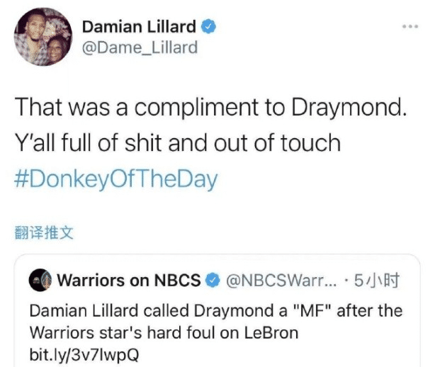 彼时利拉德就发推点评了这个动作,他在自己的个人社媒上写道:“Draymond is a mf。”在彼时的情景下,不少人将其理解为,利拉德怒喷德拉蒙德-格林,对他的防守动作表达不满。