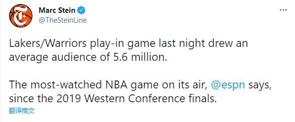 来源:24直播网05-21 10:4924直播网讯 北京时间5月21日,湖人和勇士全美直播收视率出炉,据名记Marc Stein报道,湖人对阵勇士附加赛的平均收视人数为560万人,此数字为19年西决之后最高平均收视,这也是本赛季平均收视最高的一场比赛,詹姆斯和库里两大巨星保证了收视率。