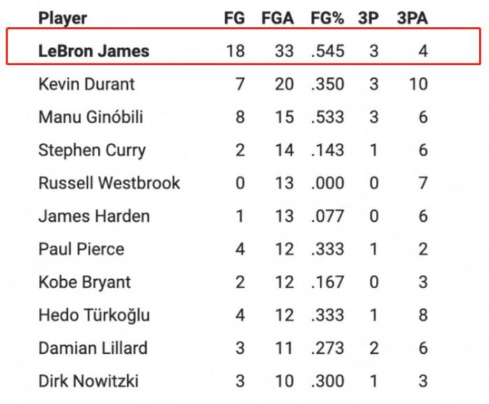 事实上真的如此吗?詹姆斯不具备这样的实力吗?刨去运气也是实力一部分的说法,美国媒体给出了一组数据,在詹姆斯的生涯中,季后赛比赛最后一分钟,投进即反超的球,詹姆斯一共得到了33次机会,这33次机会,詹姆斯命中了18球,命中率高达54.5%,其中三分球4中3,命中率高达75%。