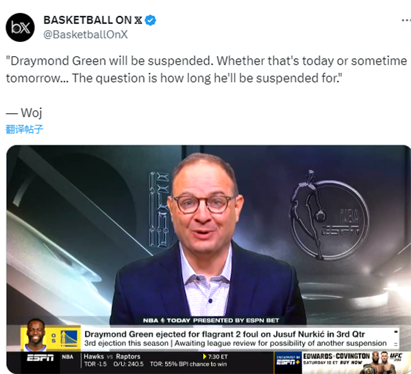 据ESPN名记woj报道,德拉蒙德-格林将会被禁赛,无论是今天还是明天的某个时刻,现在的问题是他将会被禁赛多久。