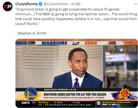 名嘴Skip也表示格林至少会被禁赛10场。