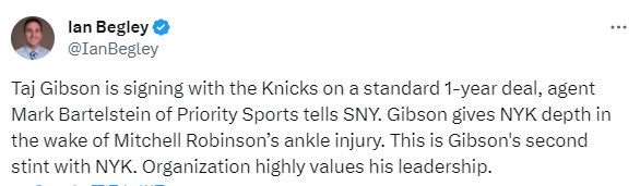 由于米切尔-罗宾逊遭遇脚踝伤势而无法出战,尼克斯才决定与吉布森签下一年合同。