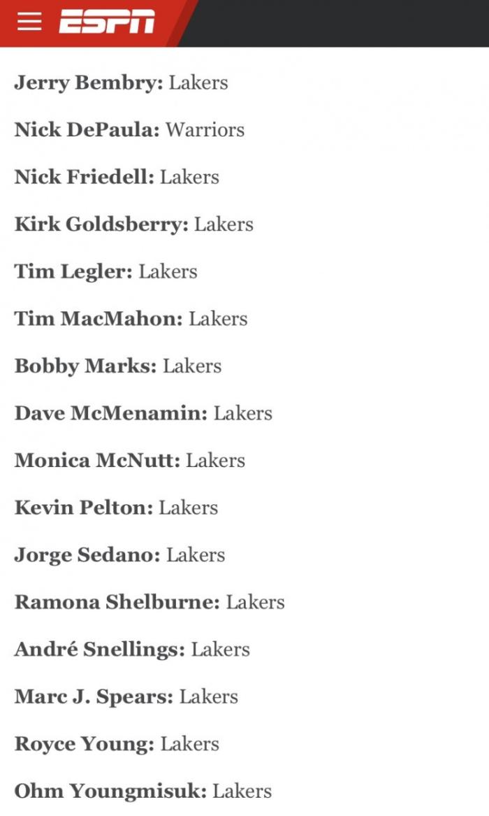ESPN16位专家仅仅只有Nick Depaula预测勇士赢球,其他15人全都预测湖人赢球,湖人对勇士的预测结果是15-1,几乎全部专家都认为湖人能赢球;这16位专家还预测其他场次的附加赛对决,奇才12-4凯尔特人、步行者10-6黄蜂以及灰熊13-3马刺。