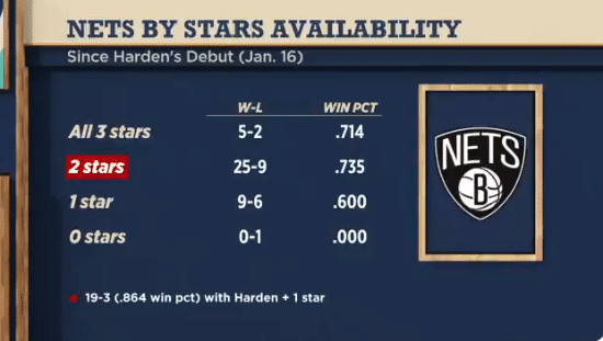 赛季至今,篮网三巨头在一起仅仅只打过7场比赛,战绩是5胜2负;任何两名巨星带队的战绩是25胜9负,其中哈登+杜兰特或者欧文的战绩是19胜3负;一名球星带队的战绩是9胜6负。