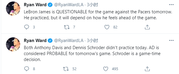 来源:24直播网05-15 17:5524直播网讯 北京时间5月15日,湖人下一场对阵步行者的伤情报告出炉,据名记报道Ryan Ward报道,浓眉和施罗德都没有参加今天的训练,浓眉大概率出战,施罗德已经解除隔离,将在赛前决定是否复出;詹姆斯参加了训练,但他被列为出战成疑,是否复出取决于他的热身感觉。