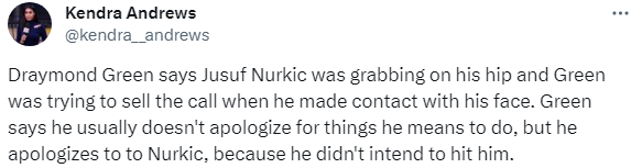 赛后追梦格林解释并向努尔基奇道歉,据名记Kendra Andrews报道,努尔基奇抓到了自己的屁股,而自己想向裁判要一个犯规,但不小心打到了努尔基奇的脸。追梦表示自己通常不会因为自己想要去做的事情而道歉,但这次自己会向努尔基奇道歉,因为自己不是故意的。