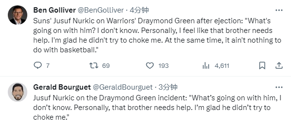 赛后努尔基奇表示:他怎么了?我不知道。就我个人而言,我觉得那个家伙需要帮助。我很高兴他没有试图锁我喉。同时这是一个与篮球无关的动作。