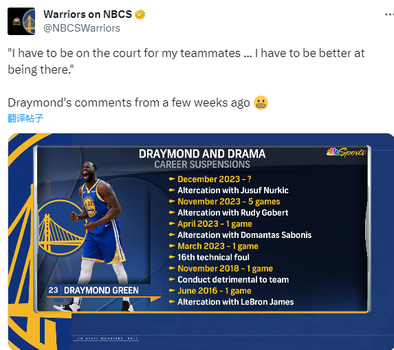 生涯至今,追梦格林已经多次被禁赛,最近一次被禁赛发生在11月15日,格林因锁喉戈贝尔被联盟禁赛5场比赛,解禁复出后格林向全队道歉认错,可脾气火爆的格林早已把自己的诺言抛之脑后,一拳打倒努尔基奇,再次面临禁赛处罚。