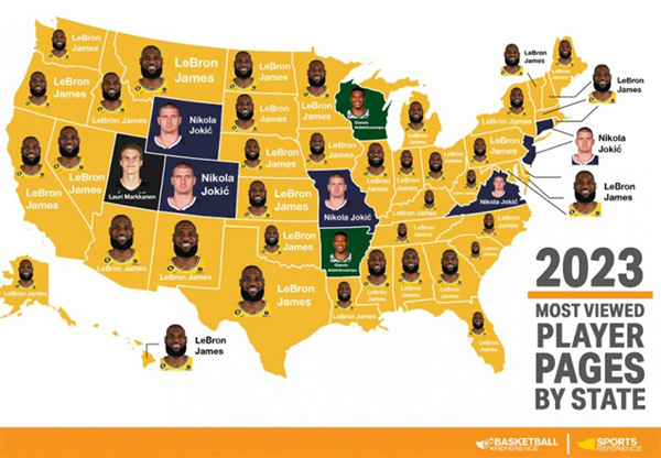 美媒BBR晒出了其网站各州被浏览次数最多的球员——詹姆斯独占41个州处于领先地位,其他上榜球员还有约基奇(5个州)、字母哥(2个州)和马尔卡宁(1个州)。