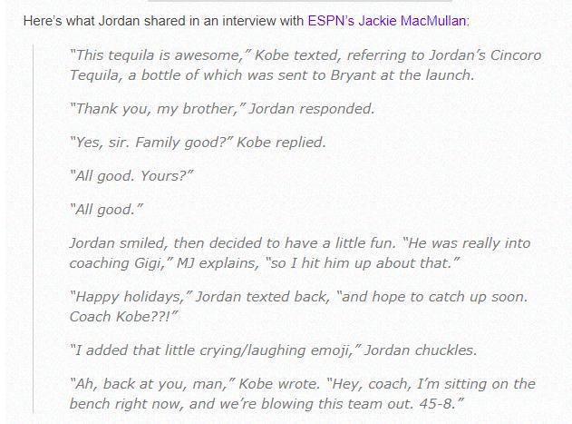 在科比的大日子来临的时候,ESPN曝光了科比和乔丹最后的聊天记录,从聊天记录中,我们也能够理解乔丹为何会在科比的追思会上泪流满面了,接下来,我们来看看这对前后脚的NBA第一人的聊天记录。