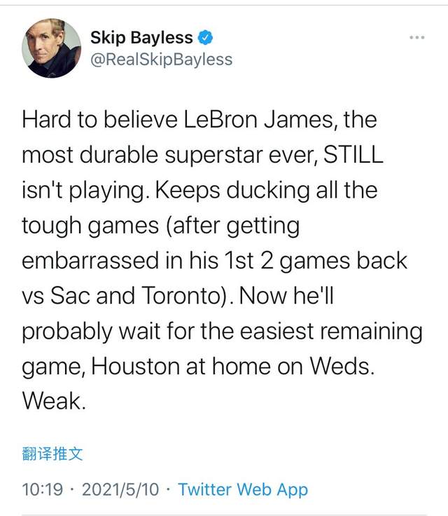 现在,就算是球队不急,詹姆斯也已经改急了,第二次复出已经被提上了日程。詹姆斯打算在下周面对尼克斯或者火箭的比赛中复出,而这也是湖人本赛季最后两场比赛。开拓者已经领先了湖人一个半胜场,湖人队大概率难以超越,詹姆斯复出只是为了季后赛中寻找状态。而今天湖人在和太阳队比赛的过程中,名嘴斯基普-贝勒斯再次批评詹姆斯:“很难想象最耐艹的超级球星勒布朗-詹姆斯,现在仍然没有出战。一直在躲避着难打的比赛(在复出之后连续输给了国王和猛龙)。现在他很可能就在等着剩下赛程里最容易的比赛(复出),周四主场打火箭。软。”
