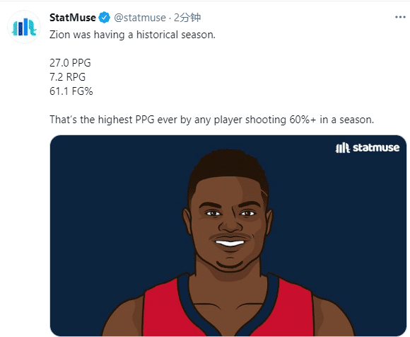 目前鹈鹕以30胜36负的战绩排名西部第11,落后第10的马刺1.5个胜场,锡安为鹈鹕出战61场,场均出战33.2分钟,能够得到27分7.2篮板3.7助攻0.9抢断0.6盖帽,投篮命中率高达61.1%。