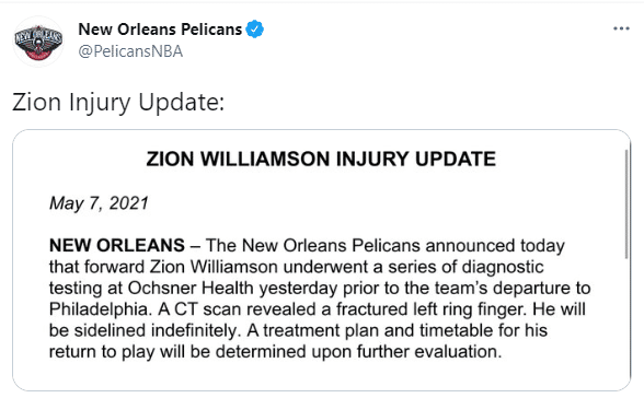 鹈鹕官方宣布,在昨日出发前往费城之前,锡安接受了一系列的检查。CT扫描结果显示锡安遭遇了左手无名指骨折,治疗方案和时间表将在进一步评估其伤情后确定。