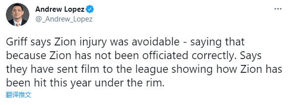 大卫-格里芬表示,锡安的受伤是可以避免的,因为锡安没有得到公正的判罚。他说他们已经向联盟发送了一部比赛影像,展示了锡安今年是如何在篮下受到打击的。