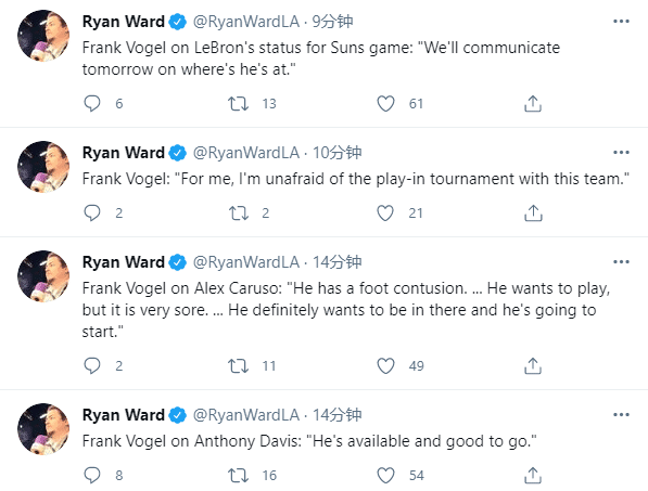 沃格尔还谈到詹姆斯的情况,沃帅表示明天将会和詹姆斯沟通一下关于他的出战状态;此前报道,詹姆斯没有随队前往波特兰,这是湖人批准的,湖人希望让詹姆斯安心养伤。