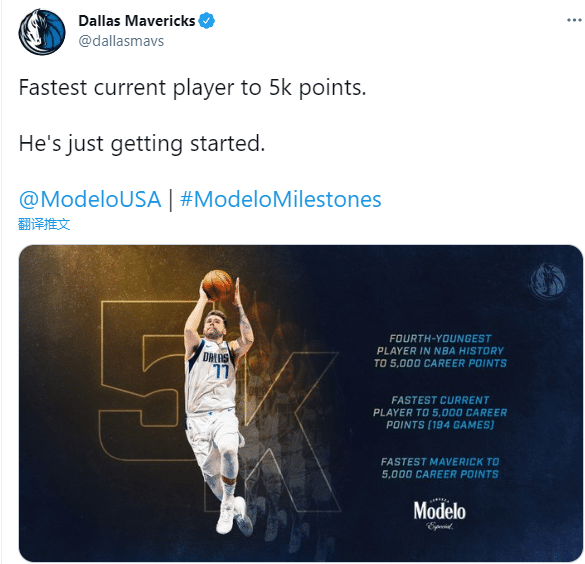 22岁东契奇里程碑之夜,独行侠官方第一时间祝贺东契奇,晒东契奇三大纪录,并且发推写道:现役最快5000分先生,他的生涯才刚刚开始而已。