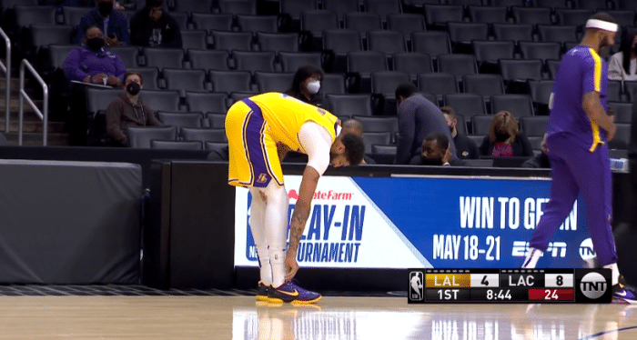 首节8分44秒,24秒进攻时间快到了,浓眉干拔跳投三分,这球明显偏离篮筐;浓眉落地后向后退了几步,不幸踩到场边广告牌,右脚崴了一下,随后浓眉捂着脚踝十分痛苦,这一幕太吓人;随后浓眉重新系紧鞋带,带伤坚持比赛,由于湖人控卫线无人可用,浓眉被迫陷入单挑,真是太难了。
