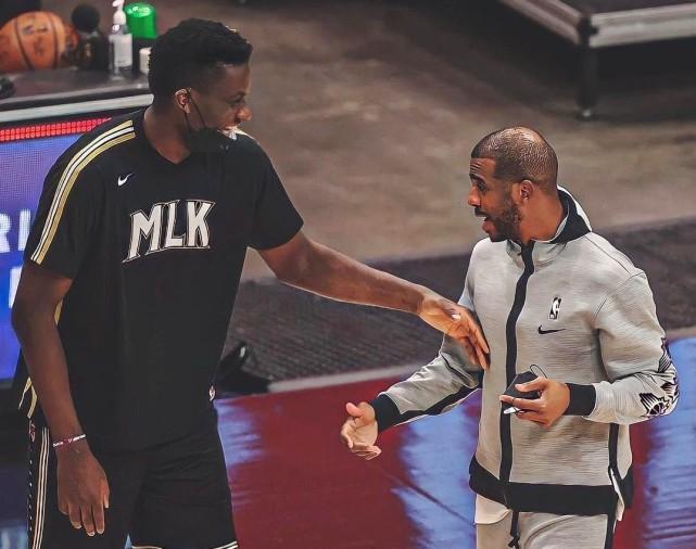 晒出这张合影前,卡佩拉还分别晒出了一张自己效力老鹰后和哈登、保罗碰面的照片(下图)。显然,这位中锋想念自己的两位大哥了。如今天各一方,但他依然难忘火箭旧时光。