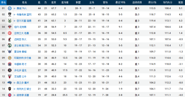 费城(44胜21负):火箭、鹈鹕、活塞、步行者、热火、魔术、魔术;