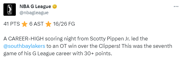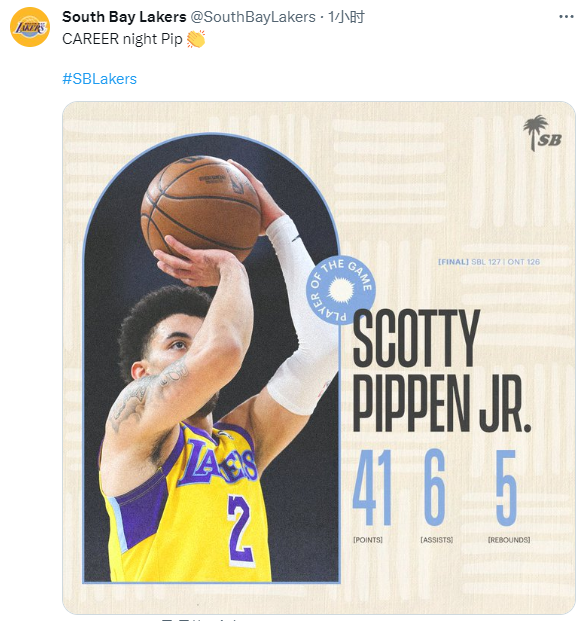 小皮蓬狂砍41分再次带队客场取胜,南湾湖人官方祝贺他打出生涯之夜;本赛季南湾湖人客场战绩5胜2负,总战绩7胜4负;最近一段时间,小皮蓬的表现很不错,本赛季场均拿到21.5分5.8助攻4.7篮板以及2.1次抢断。