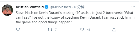 赛后纳什谈到杜兰特10次助攻仅有2次失误,他表示:我还能说些啥?能够执教杜兰特这样的球员真是太奢侈了。我其实只需要把他放到场上,然后就会有好的事情发生。