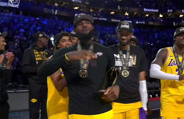 湖人夺冠后詹姆斯第一个举起冠军奖杯庆祝,高举奖杯与队友疯狂庆祝,之后老詹把奖杯传给队友,浓眉抱着奖杯大笑,最终詹姆斯荣获首届季中赛MVP奖杯。