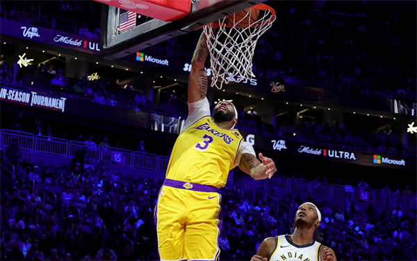 季中决赛冠军争夺战,浓眉第一节打满12分钟,开场6投全中多次杀到禁区暴扣,持球背打身体失衡仍打成2+1,单节首节13分8篮板扛起球队;第二节,詹姆斯发力连续杀到内线得分,当老詹陷入犯规困扰,浓眉和里夫斯挑大梁,半场打完湖人领先5分,浓眉拿到17分11篮板的两双。