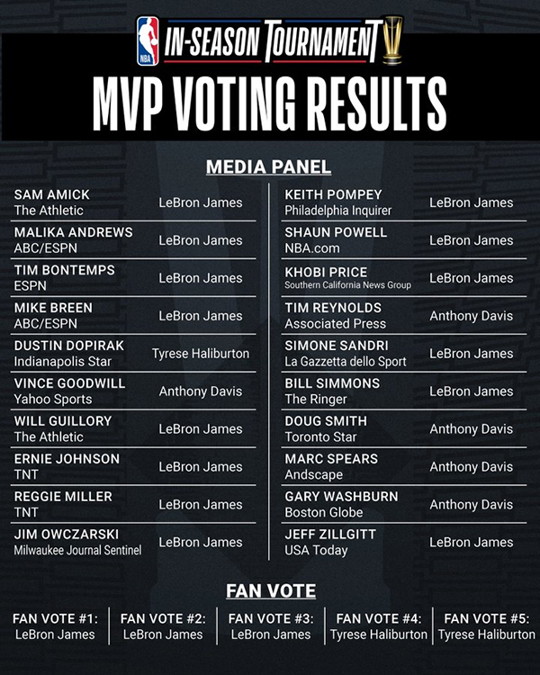 季中赛MVP投票结果出炉,在20张媒体投票中,詹姆斯获得14票,浓眉5票,哈利伯顿1票;球迷投票5票詹姆斯获得3票,哈利伯顿2票。