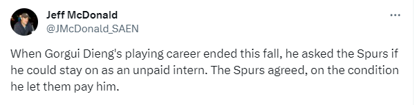 对于留在马刺继续工作,吉昂表示:我做的事是自由的。我在办公室中学习;当他们开始训练时,我来到这里帮助球队,我来这里只是为了和他们在一起,帮助他们。