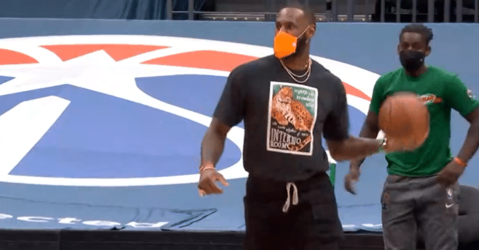 詹姆斯身穿黑色T恤和黑色短裤,戴着橘黄色的口罩,继续随队出征客场;虽然因伤休战,但詹姆斯一直都是摄像师抓拍的焦点人物,现场镜头经常抓拍詹姆斯。