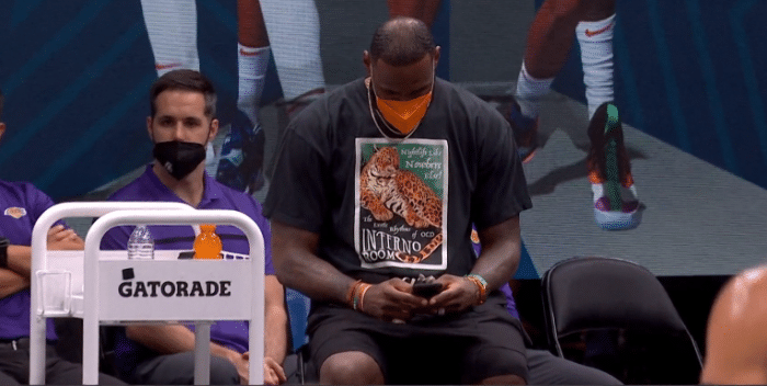 第二节,镜头又是多次给到詹姆斯,期间抓拍到老詹坐在场边玩手机,用两只大手抱着手机,两眼紧紧盯着屏幕,十分惬意。